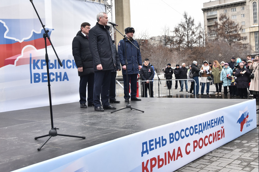 Губернатор Андрей Травников поздравил жителей Новосибирской области с Днём воссоединения Крыма с Россией. Центральное праздничное мероприятие прошло 18 марта в Театральном сквере Новосибирска перед НОВАТ.